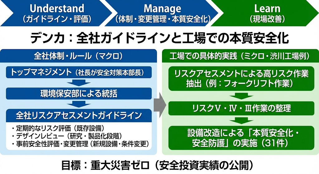 ガイドラインに基づく一貫したリスク管理(Understand/Manage)と、工場レベルでの高リスク作業削減(Learn/Manage)がセットになっています。