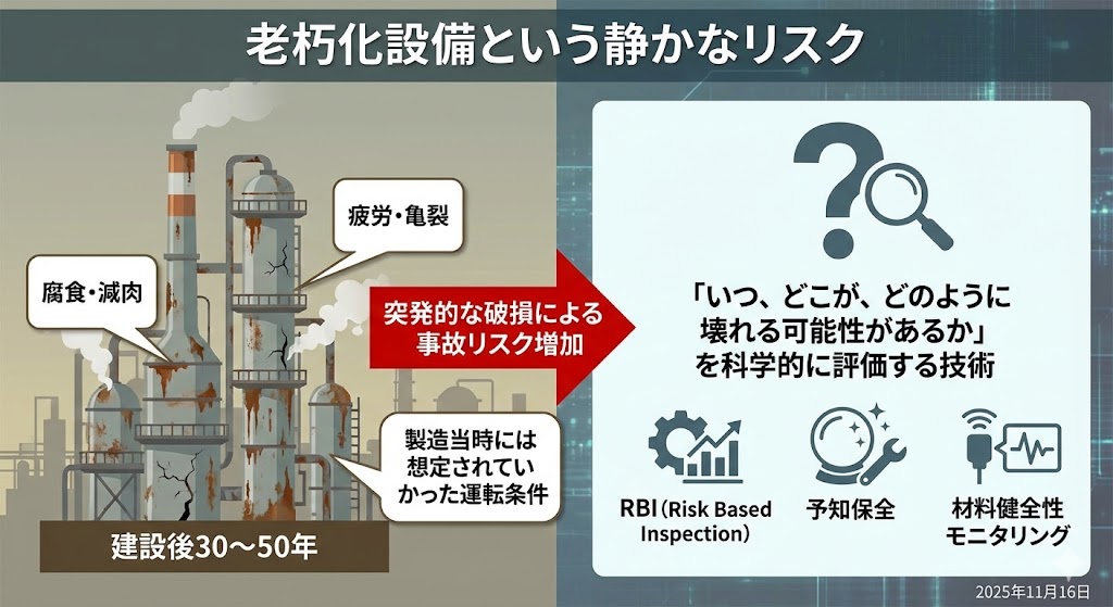 多くのプラントは建設後30〜50年が経過し、以下の劣化が顕在化しています。