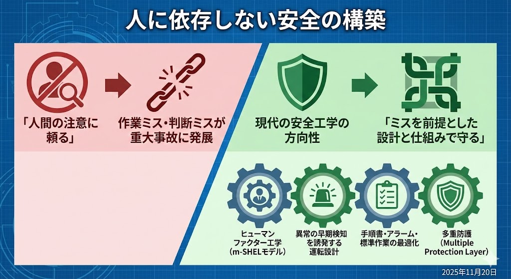 設備・手順・組織・教育を一体として設計しない限り、ヒューマンエラーを源とする事故は根絶できません。