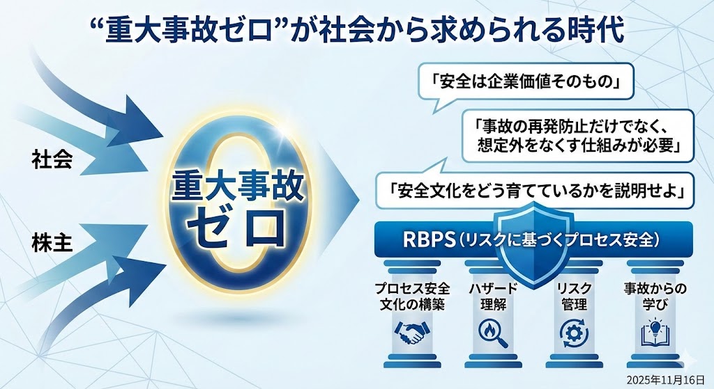 これに応えるため、安全工学では **RBPS(リスクに基づくプロセス安全)**を中心とした体系的な枠組みが必要になります。